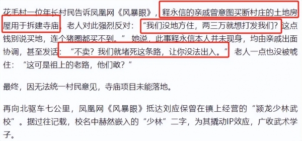 不只如此据悉释永信的亲属还在村里想要强行修寺庙,遭到乡民的激烈反抗,终究没有完成。