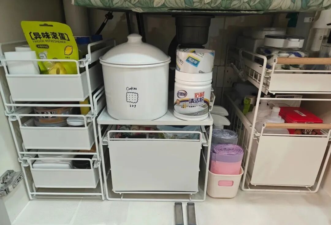 ③双层架收纳:网友@阿红:水槽下橱柜加双层架,将厨房清洁用品全塞进去,门后还能贴个小盒子放海绵。柜门日常需要的百洁布、洗洁剂、刷子、塑料袋等可以全部存在这里。