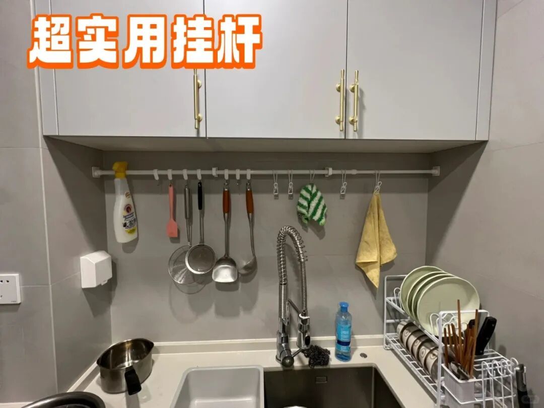 ②挂杆收纳:网友@小小:我家小厨房,在洗菜区的墙面安装挂杆来收纳洗碗巾、勺铲、刀架和小工具,用起来方便,也节省了橱柜的空间,拿取极为方便,也很有条理和整洁。