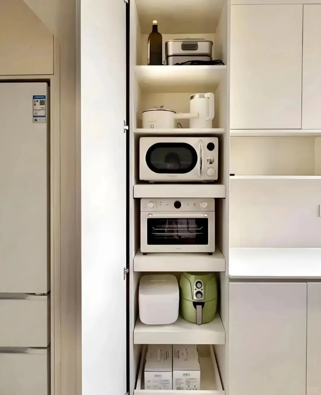 网友@苹果:电器一旦“挪走”,小厨房立刻清爽一大半,为了解放台面,在做橱柜的时候,将电器收入柜中,整洁美观,务必预留好插座。