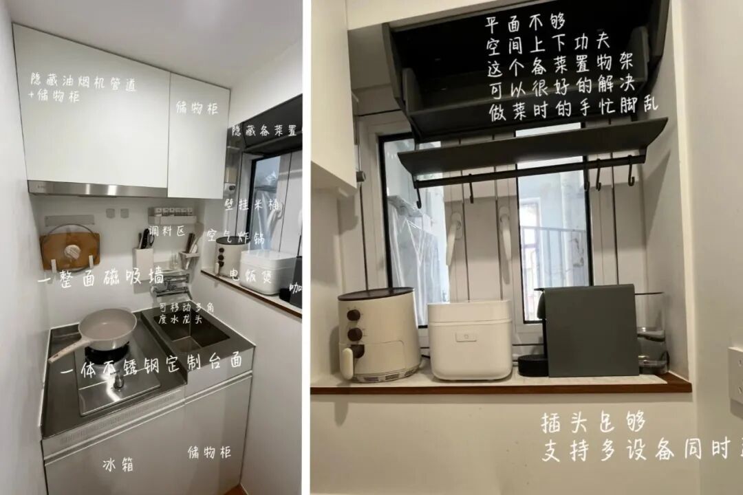 由于面积真的太小了,为了操作便捷,提前规划好了各个功能区,冰箱,油烟机,灶台,空气炸锅,电饭煲,更不可思议的是个咖啡机,还有很多隐藏的柜子。上方还有个隐藏的置物架,解决备菜时盘子无处安放的问题。